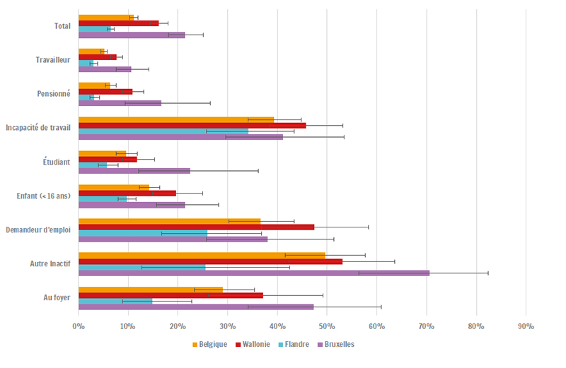 Les personnes faisant le plus fréquemment face à une situation de privation matérielle et sociale sont les demandeurs d’emploi, les personnes en incapacité de travail, les personnes au foyer et les autres inactifs. À l’opposé, les travailleurs, les pensionnés et les étudiants font moins souvent face à ces difficultés. On retrouve ce lien entre statut socio-professionnel et privation dans les trois régions, mais avec des différences de niveaux notables. À situation équivalente, le risque de privation est plus élevé en Wallonie qu’en Flandre. À Bruxelles, les taux sont similaires, et souvent légèrement supérieurs, à ceux qu’on observe en Wallonie.