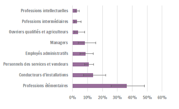 La privation matérielle et sociale touche surtout les professions « élémentaires » selon la Classification internationale Type des Professions (ex. manœuvre, aide de ménage, manutentionnaire, aide de cuisine), puisqu’environ un tiers d’entre eux y sont confrontés.