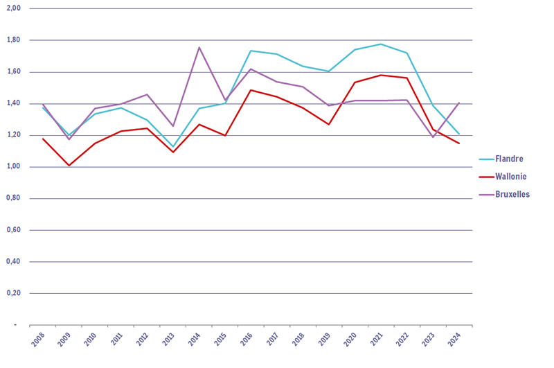 Sur l’ensemble de la période, le taux de dynamisme entrepreneurial wallon est inférieur à celui de la Flandre et de la Région de Bruxelles-Capitale (à l’exception de 2020 à 2023 pour Bruxelles-Capitale).