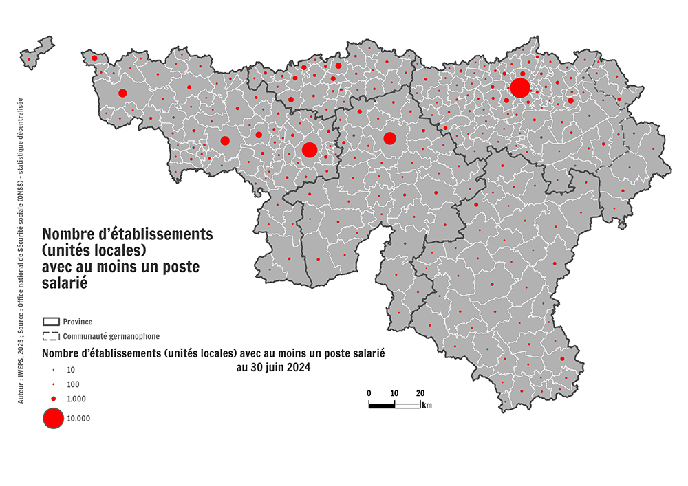 24 % des 89 246 établissements implantés en Wallonie au 30 juin 2024 sont localisés dans les 6 villes suivantes : Liège, Charleroi, Namur, Mons, Tournai et La Louvière, soit respectivement 7,1 %, 5,3 %, 4,3 %, 2,9 %, 2,6 % et 1,8 % des unités locales wallonnes. 683 unités, dépendant d’entreprises étrangères sans implantation en Belgique (0,8 % des unités wallonnes), ne sont pas représentées sur la carte ci-dessus car elles ne sont pas attribuables à une commune (voir pertinence et limites).
