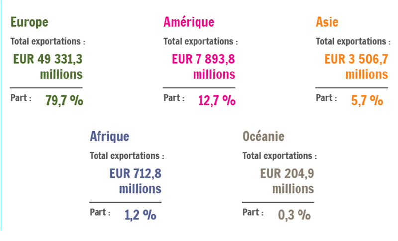 En 2024, la Wallonie a exporté 61 915,2 millions d’euros de marchandises dont 49 331,3 (79,7 %) vers les seuls pays européens. Ensuite, vient le continent américain avec 7 893,8 millions d’euros (soit 12,7 % du total). Ces deux continents totalisent 92,4 % des exportations wallonnes. L’Asie représente 5,7 % du total des exportations, soit 3 506,7 millions d’euros, l’Afrique 1,2 % et l’Océanie 0,3 %. Le total des exportations wallonnes a diminué en 2024 de -7,7 % ce qui peut s’expliquer par la forte incertitude mondiale et le ralentissement de l’activité économique. Ce sont les exportations vers l’Europe (-10,8 %) et l’Afrique (-9,1 %) qui ont été le plus impactées. Par contre, les exportations vers le continent Américain ont augmentées de 8,4 %. De même, les exportations vers l’Asie ont crû de 11,6 %.