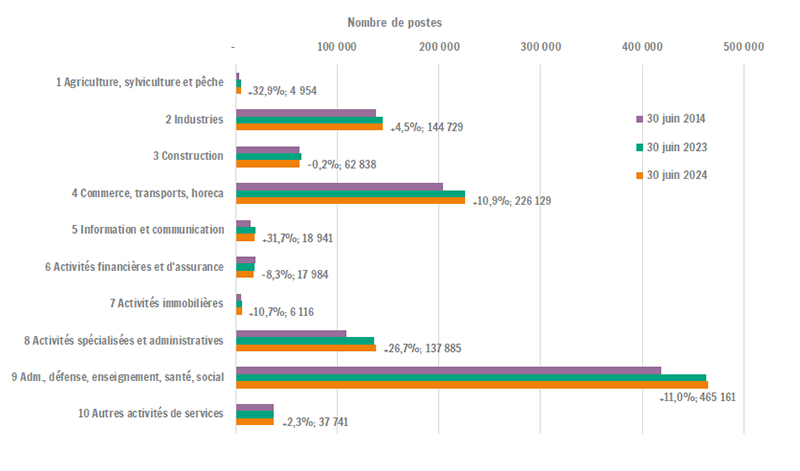 Entre le 30 juin 2014 et 30 juin 2024, la Wallonie a gagné 109 108 postes, soit une augmentation de 10,8 % sur 10 ans. En 2024, on compte 3 318 postes de plus qu’en 2023 (+0,3 %).