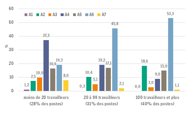 Au 30 juin 2024, 37,3 % des postes des unités locales de moins de 20 travailleurs sont dans le secteur du commerce et de l’horeca. Dans les unités locales de 20 travailleurs et plus, la moitié des postes (50,1 %) sont dans le secteur public (A6). Les secteurs de l’agriculture, de la construction et des autres activités de services sont mieux représentés dans les petites unités et l’industrie est le deuxième secteur en importance (18,6 % des postes) dans les unités de 100 travailleurs et plus.