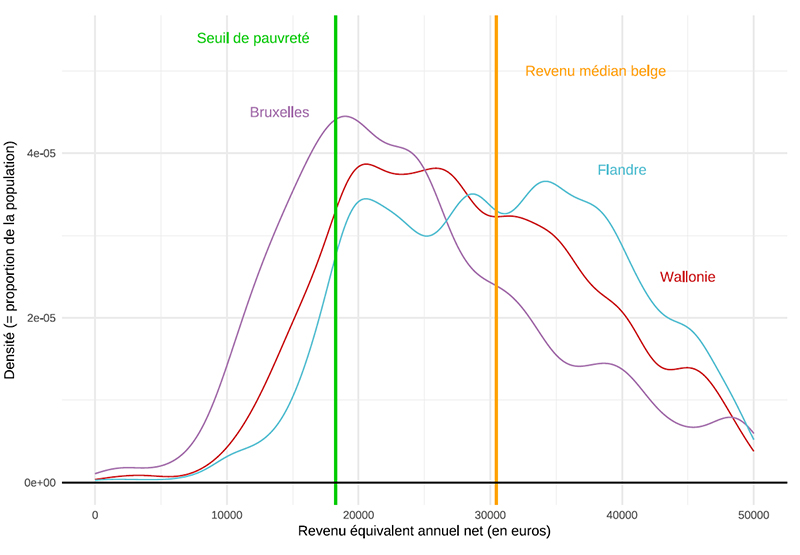Le graphique de densité répartit la population de chaque région selon le revenu équivalent du ménage. L’aire en dessous de chaque courbe de densité et à gauche du seuil de pauvreté représente la proportion de la population qui est considérée comme en risque de pauvreté. Ce graphique illustre bien le fait que le taux de risque de pauvreté mesure l’importance du bas de la distribution par rapport à la médiane nationale. Autrement dit, il s’agit de voir à quel point il y a des petits revenus par rapport à un revenu standard (le médian belge).